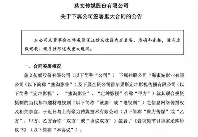 但是再回頭來對比一下版權劇,頓時就覺著不值一提了,8月9日,慈文傳媒發布公告稱:下屬控股公司蜜淘影業及定坤影視就其聯合投資攝制的當代都市題材電視劇與聚力傳媒簽署了《音視頻節目獨家采購協議書》。協議中規定合同金額為8億元或7.6億元(視不同衛視首播平臺而定)。